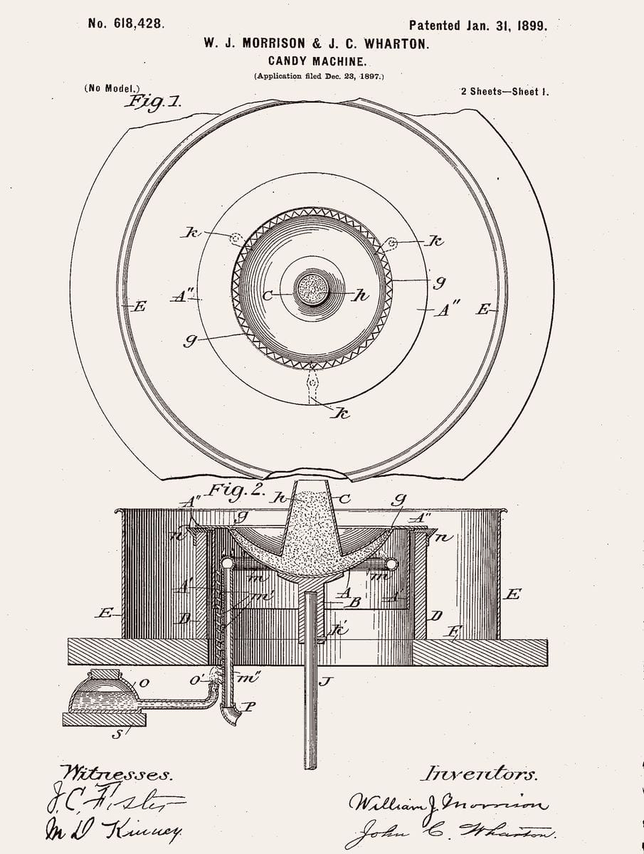 La producción industrial del algodón de azúcar, como lo conocemos hoy, comenzó en 1897 con William Morrison y John C. Wharton, quienes inventaron la primera máquina para su elaboración, la cual se presentó en la Exposición Universal de Paris de 1900. Otros atribuyen la invención al vendedor Thomas Patton, quien hervía el azúcar hasta lograr un estado caramelizado, para luego formar largos hilos.